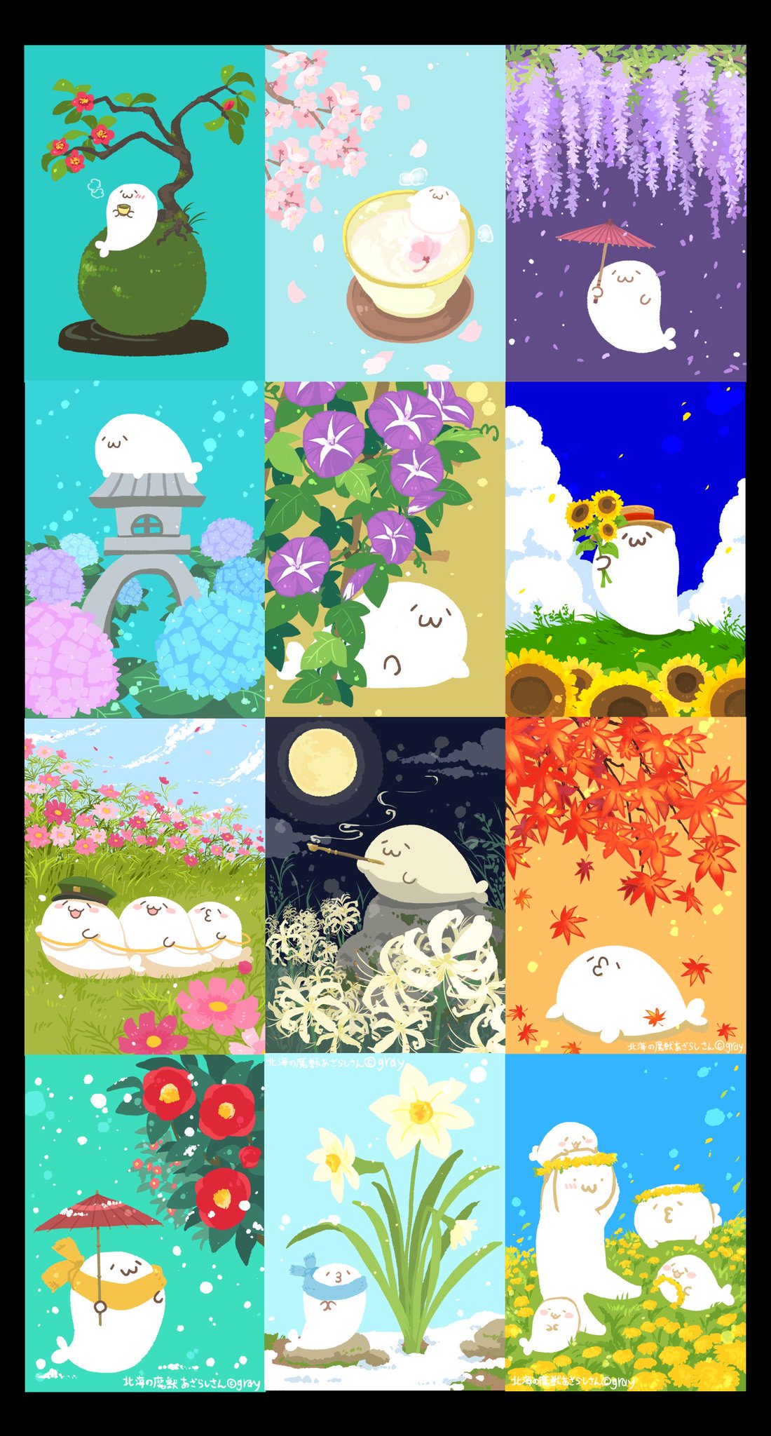 グレー あざらしさん Di Twitter 18年の3月 19年3月までの毎月配信壁紙をまとめてみた 19年1月のイラストはお年賀仕様だったので割愛 みんなはどれがお気に入りでしたかね あざらしさん